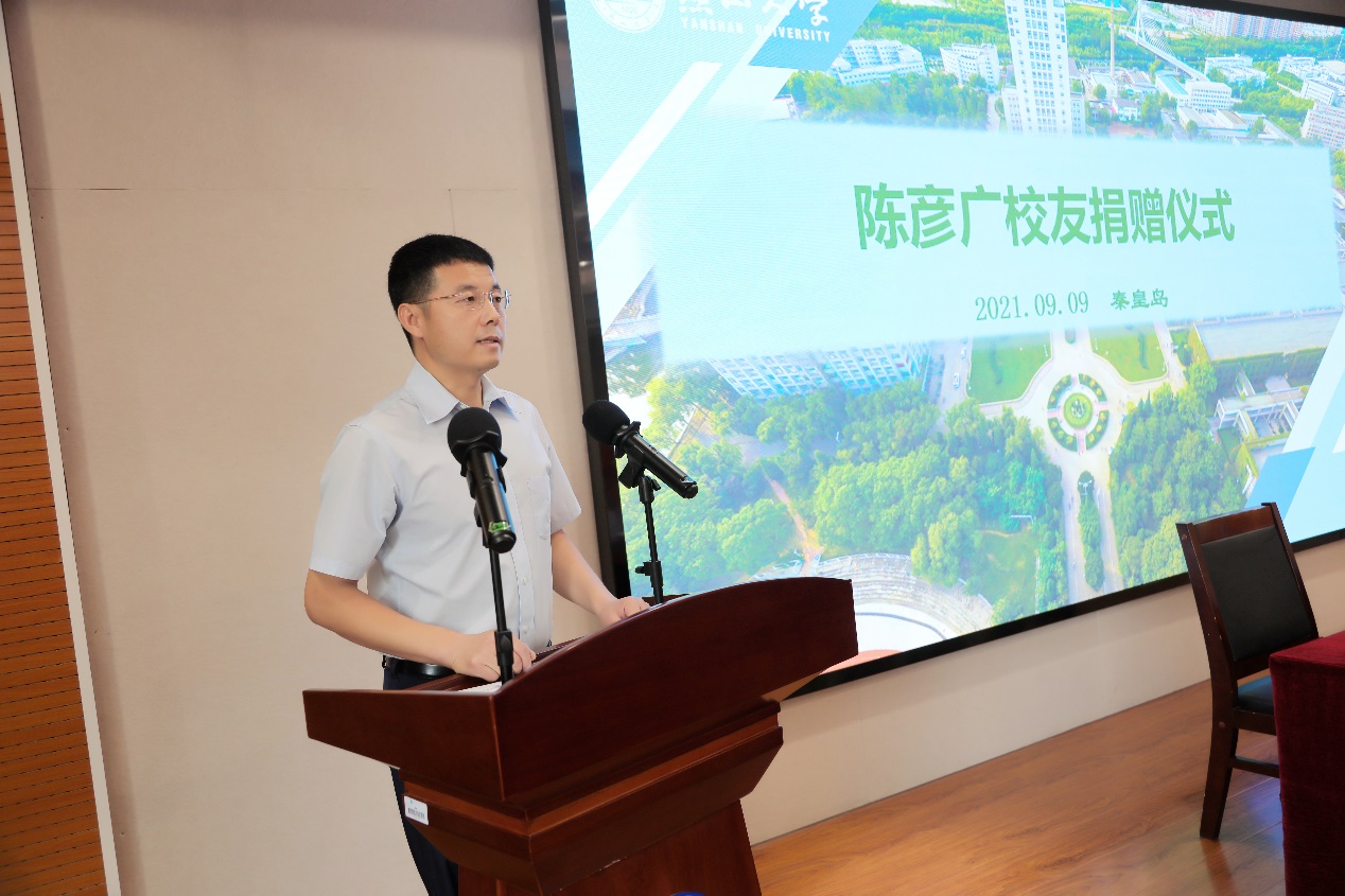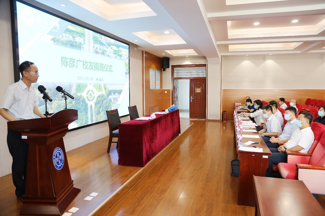 的渊源,以及陈彦广校友萌生捐赠想法的初衷,对陈彦广校友的爱院情节表示赞许与衷心的感谢。她表示,陈彦广校友多年来一直关注学院发展,在人才培养、专业建设等多方面为学院助力。校友是学院最为宝贵的资源和财富,希望校友们继续和学院保持密切联系,在全面参与母校人才培养、科技服务、文化传承中打造校友文化品牌。