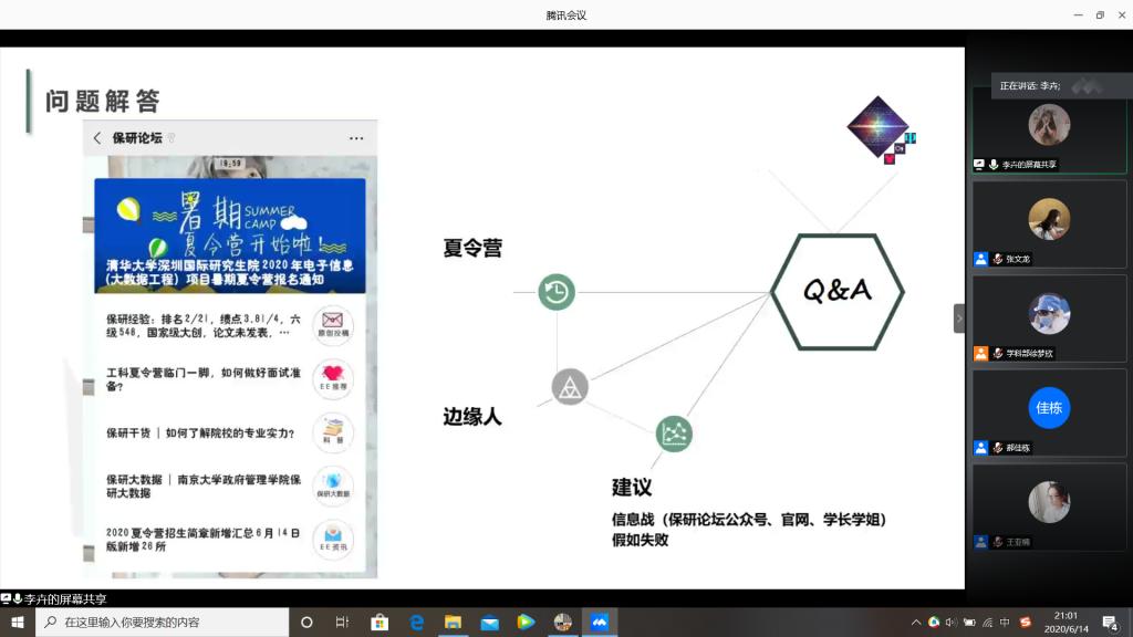 由于正值疫情期间,此次交流会通过云端方式开展。通过分专业形式,共开设了四场腾讯会议同时进行,每场会议分别邀请了3至4名学长学姐进行经验分享。交流会上,优秀考研代表们以自己的切身经历向同学们介绍自己的考研心得,结合自己的考研经历详细的给同学们讲解了读研的必要和在备考期间应注意的问题,包括考研各科的复习方法、考研信心的树立、考研计划、备考心态的调整、生活饮食习惯、作息时间安排,以及有关选择专业方向和复试等方面的一些心得。对于如何准备考研,学长学姐们从专业、英语、政治三方面都进行了分析。在经验分享会的提问环节中,同学们积极踊跃,争先恐后的提出心中疑问,学长学姐们也有针对性的答疑解惑,有效解决同学们的问题。整个交流会同学们积极踊跃、精神饱满。