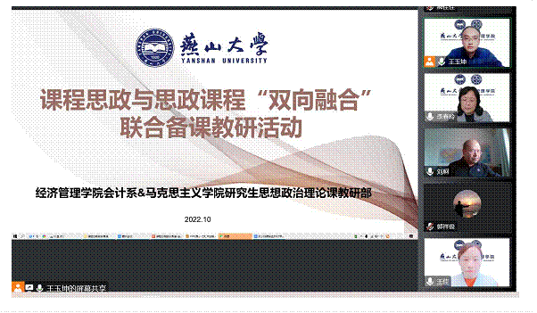 会计系与马克思主义学院研究生思想政治理论课教研部于2022年10月20日15:30-17:00通过腾讯会议的方式开展了课程思政与思政课程“双向融合”联合备课教研活动。参加会议的人员包括:av中文