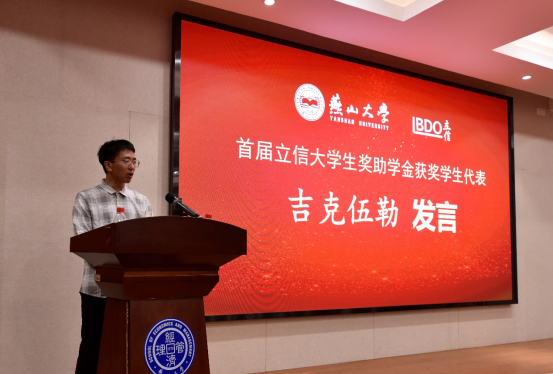 2019级会计专业吉克伍勒作为获奖学生代表发言。吉克伍勒表达了对郭健师兄关心关爱,立信会计师事务所急公好义,学校、学院、老师们悉心栽培的感激之情,表示将怀感恩之心,勤奋学习,回馈母校,奉献社会。