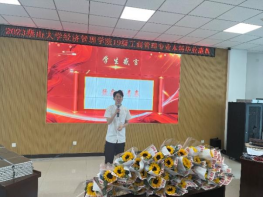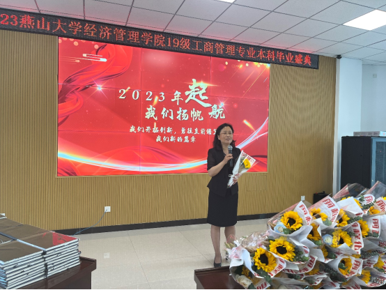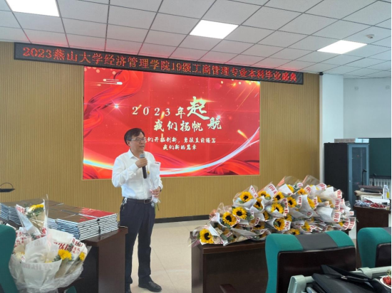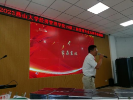随后,工商管理系主任王玖河教授一段走心的饱含深情的发言,句句说在同学们的心坎上,引起阵阵掌声,他希望每位工商人都传承和发扬燕大人“奋斗基因、工匠精神、卓越品质、家国情怀”的文化品格,追逐光、靠近光、成为光、散发光,奋力书写青春绚丽华章。