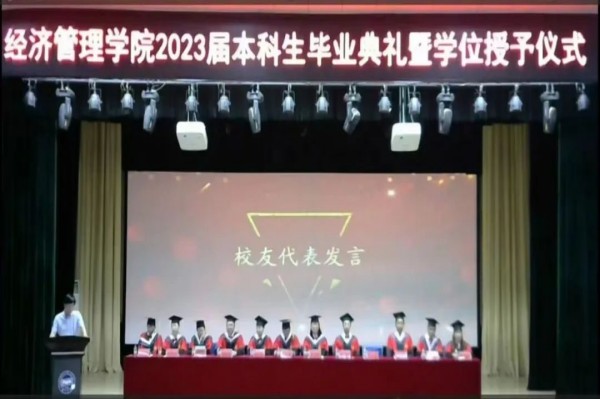 王光代表全院3万名校友发言,表达对师弟师妹们顺利毕业的祝贺,并分享了自己毕业后的人生感悟。王光希望师弟师妹人生路上志存高远、心系家国、胸吞百川,以成就人生。希望毕业生积极参与校友组织,为母校、校友及当地经济社会建设多做贡献。