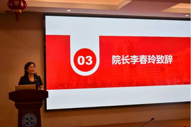 院长李春玲代表学院致辞,她介绍了学院及MBA教育中心的发展历史、使命愿景、课程设置、人才培养、办学成果等方面的情况,希望广大新生树立远大理想、牢记使命担当,发扬av中文