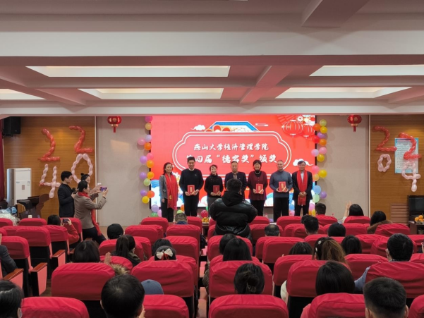 第四届德容奖”的王玖河、臧秀清、张亚明、宣杰、付岗五位教师颁奖,表彰他们在本年度教书育人过程中取得的突出成绩。