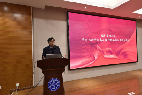 于3月28日下午在经管楼A218学术报告厅召开师德师风集中培训会。学院党政领导班子成员、全体教职工参加了会议。会议由副院长靖鲲鹏主持。