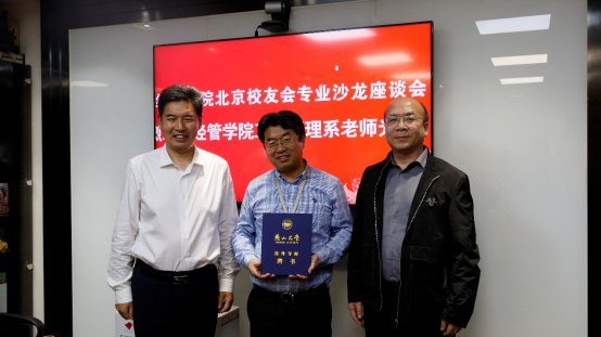 学院党委书记张振华、副院长靖鲲鹏、王玖河教授一起为工商管理专业建设做出诸多贡献的校友张继超、孙锴颁发职业成长导师聘任证书。