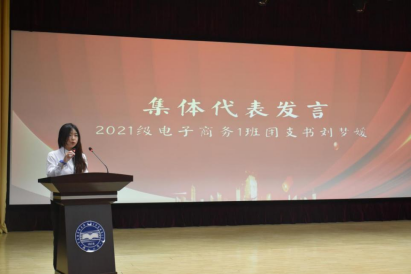 2021级电子商务1班团支书刘梦媛同学作为集体代表发言。她通过总结班级的成就和展望未来,展现了班级的团结、积极和向上的精神面貌。这份荣誉将激励着大家继续前行,不断追求更高的目标。在未来的学习生活中,全体同学将以更加饱满的热情和更坚定的信念,努力提升自己,为学校争光添彩。