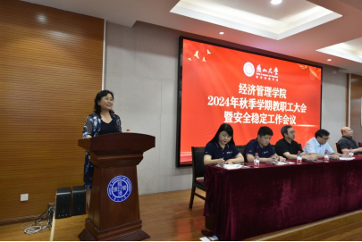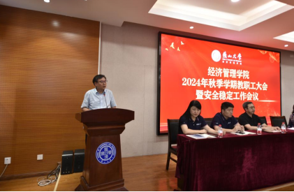 在经管楼A218报告厅召开2024年秋季学期全体教职工大会暨安全稳定工作会议,学院领导班子成员、全院教职工参加了会议。会议由学院正处级专职辅导员杨小丽主持。