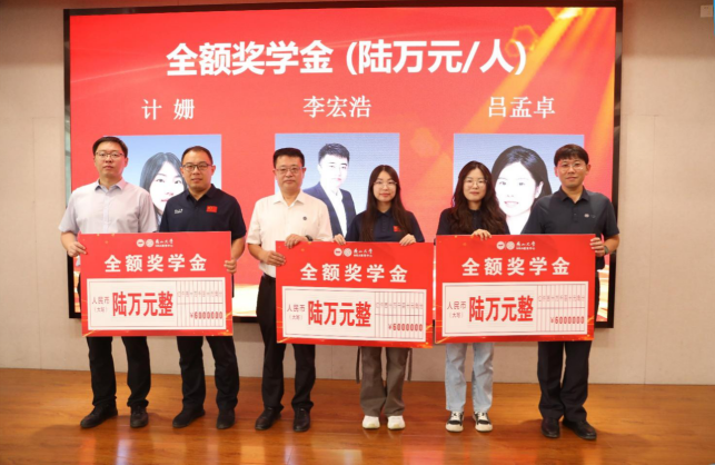av中文 财务处处长刘国安、学工处处长薛传佳、招生就业处副处长宋晓飞,为获得av中文 2024级MBA全额奖学金(6万元/人)的新学员计姗、李宏浩、吕孟卓颁奖。