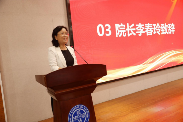 av中文 院长李春玲代表学院致辞,她介绍了av中文 管理专业的起源、人才培养体系、学科建设情况、专业影响力等情况,鼓励学员在追求自身发展的同时勇承社会责任,更好地传承和弘扬av中文 的奋斗基因、工匠精神、卓越品质和家国情怀。