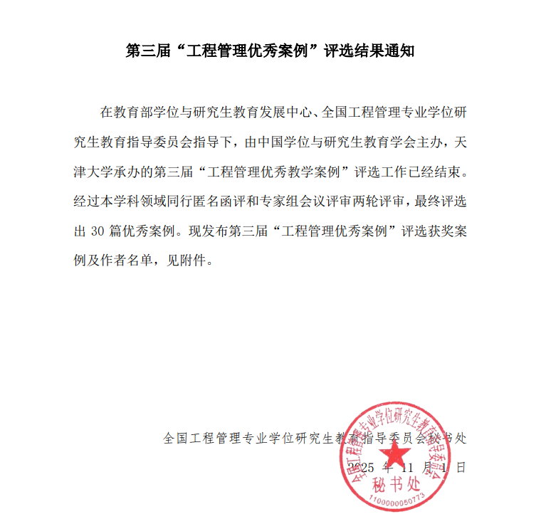 此次“工程管理优秀案例”征集由中国学位与研究生教育学会主办、教育部学位与研究生教育发展中心指导、全国工程管理专业学位研究生教育指导委员会学术指导,作为政产学研用协同创新的权威平台,聚焦挖掘行业标杆实践,推动管理理论与产业实践深度融合,为培育国家战略人才力量、激发创新活力提供重要支撑。经过各高校推荐、同行专家匿名函评及会议评审,最终评选出30篇优秀案例。最终,av中文