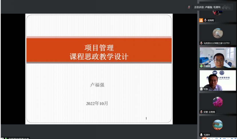 卢福强副教授介绍《项目管理》课程思政相关内容,包括课程思政目标、大四学生学情分析、课程思政设计总体思路,将爱国情怀、奉献精神、实事求是等思政元素融入到项目沟通、项目成本管理、项目质量管理的知识点中。