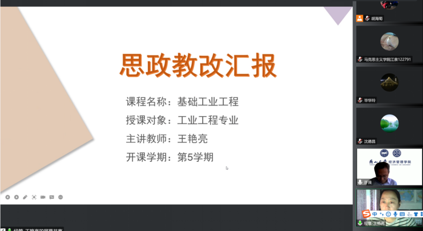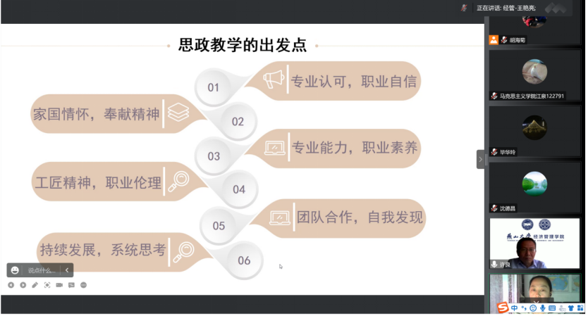 首先,工业工程基层教学组织负责人许良老师和中国近现代史纲要教研部沈德昌老师分别介绍双方参会人员和各自专业的教学目标和课程思政设计整体情况。许老师强调工业工程培养的是复合型人才,需要工科、理科和经济管理等多学科知识。鉴于工业工程的学科特点,课程思政早已融入到基层教学组织开设的课程中,并且在教育部提出课程思政建设后,进一步进行完善和提升,将“立德树人、家国情怀、责任担当、工匠精神、精益求精、职业素养、爱国敬业”的思想融入到专业课程中,做到100%全覆盖。