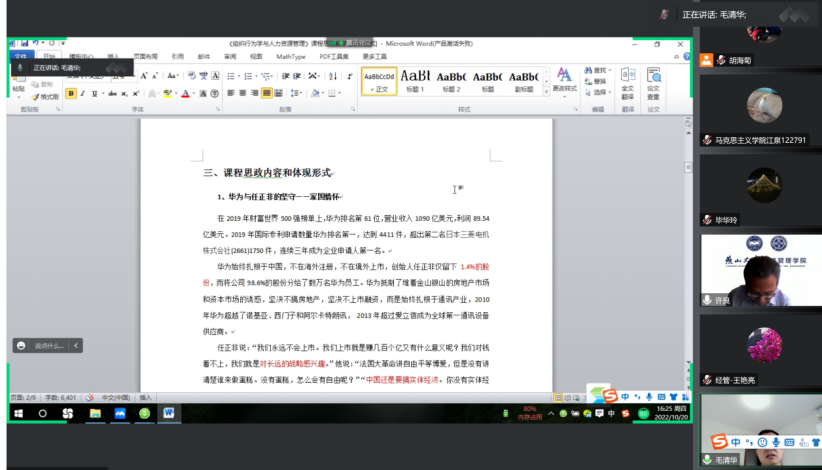 毛清华教授介绍《组织行为学与人力资源管理》课程思政教学情况,包括课前准备、课中授课和课后回顾三个教学环节和组织形式,并以“华为与任正非的坚守”“毛泽东的指挥艺术”“中国改革开放史”等为典型案例介绍开展课程思政教学的具体设计,帮助学生树立家国情怀、领导的艺术和沟通技巧。