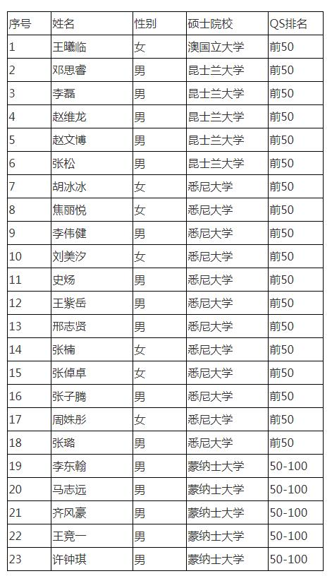 2019年开始,本项目毕业就业形势较好,除一次就业率较高外,升学率也较高,突出的是申请攻读国外大学的学生逐年增加。如,2015年首批赴澳学习的30名学生中,23名同学于2019年7月被澳大利亚国立大学、昆士兰大学、悉尼大学和蒙纳士大学录取,继续攻读硕士学位。其中78.26%的学生被QS世界排名前50的高校录取,100%的学生被QS世界排名前100的高校录取。详细信息见下表: