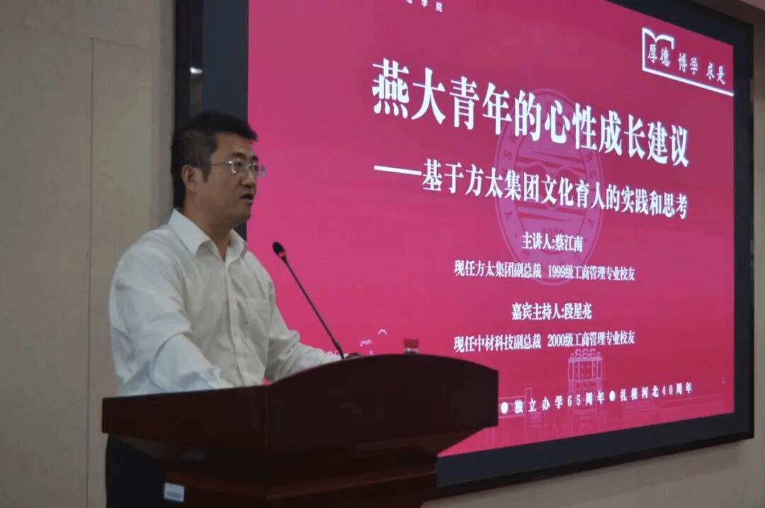 迎来建校溯源105周年、独立办学65周年、扎根河北40周年的历史节点,一场聚焦青年心性成长、融汇校企文化育人经验的讲座于9月6日15时在经管楼A218报告厅隆重举行。本次讲座以“燕大青年的心性成长建议——基于方太集团文化育人的实践与思考”为主题,特邀方太集团副总裁、1999级工商管理专业校友蔡江南担任主讲人,中材科技副总裁、2000级工商管理专业校友段星亮担任嘉宾主持。