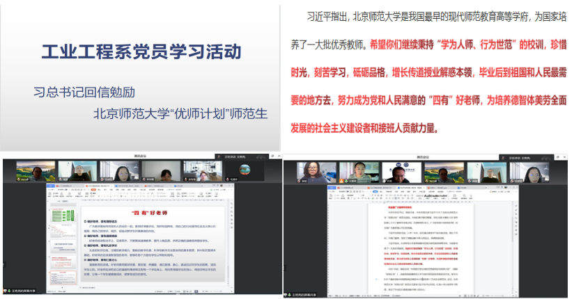 2022年10月20日下午,按照学院党委学习活动安排,工业工程系支部全体党员集中学习“习近平总书记给北京师范大学“优师计划”师范生的回信”,并展开讨论。
