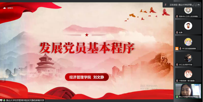 本科生第五党支部书记刘文静老师受邀分别进行了题为“与祖国共成长”和“发展党员程序”的党课讲授。本次培训由党务中心学习活动部赵晗琳主持,第67期分党校全体发展对象参与此次培训。