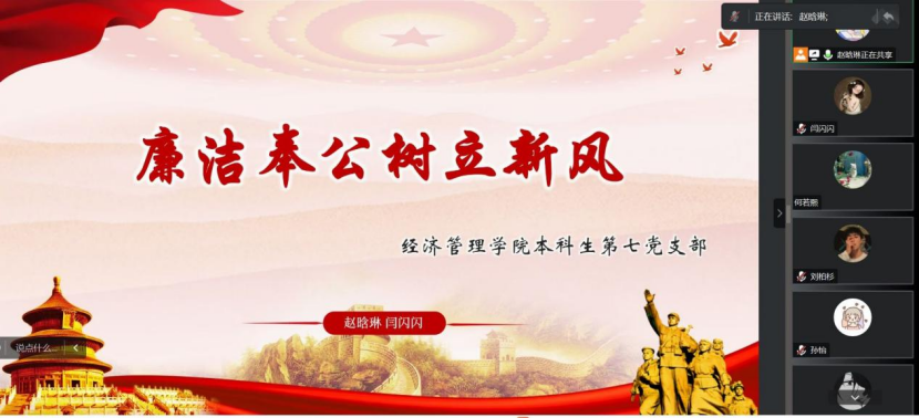 本科生第七党支部开展“廉洁奉公树立新风”主题党日活动。本次主题党日活动通过腾讯会议线上开展,由支部党员赵晗琳同志主讲。