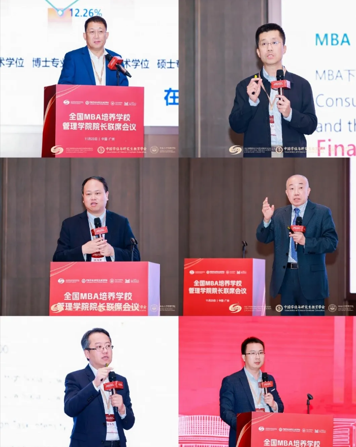 中山大学党委副书记王帆、教育部学位管理与研究生教育司培养质量处四级调研员王亮先后致辞;全国MBA教指委委员兼秘书长,清华大学党委常委、副校长杨斌总结了过去一年全国MBA教指委工作取得的关键成果,并对下一阶段的重点工作进行解读;教育部学位与研究生教育发展中心副主任亓彦伟,全国MBA教指委副主任委员、复旦大学管理学院院长陆雄文,全国MBA教指委委员、浙江大学管理学院院长谢小云,全国MBA教指委委员、哈尔滨电气集团有限公司原董事长斯泽夫,明阳集团党委书记、董事长,分别作了题为《聚焦两大任务,用好四个抓手——推动专业学位研究生教育高质量发展》《MBA教育使命与创新变革探索》《管理科学,兴国之道——服务中国式现代化建设的MBA教育创新》《从经济社会新变化看MBA教育》《“双碳”目标下产业创新变革与人才需求》的主题发言。