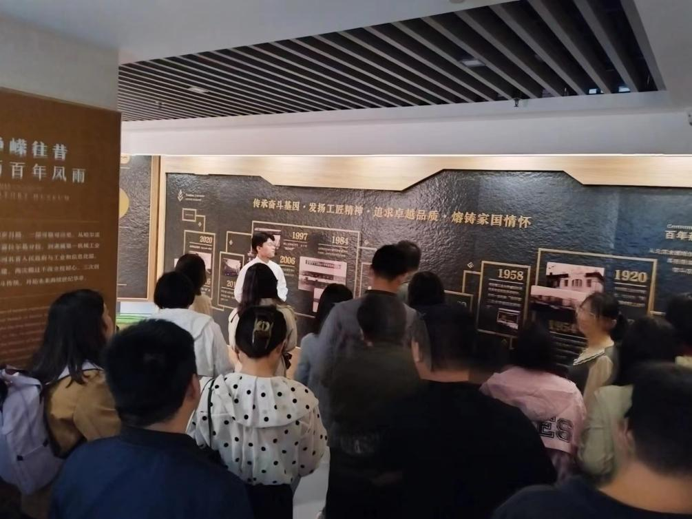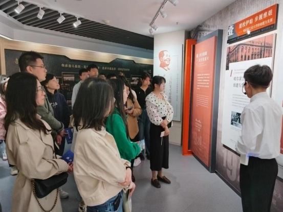 学校创立展板前,创立初期的艰苦、学习场所的简陋、老师们辛苦教学的场景历历在目。实物展柜里,工作时的工装、教材、上课场景面仍在眼前。随着一张张照片、一件件展品映入眼帘,一幅幅鲜活生动的历史画卷在眼前徐徐展开,耳畔仿佛听到一百年前学校发展融入时代洪流的磅礴之音。大家聚精会神地聆听讲解,时而驻足观看,时而交流讨论,惊喜不断,感慨万千。同学们为燕大前辈筚路蓝缕、艰苦创业的奋斗历程和披荆斩棘、勇立潮头的开拓精神深深感动