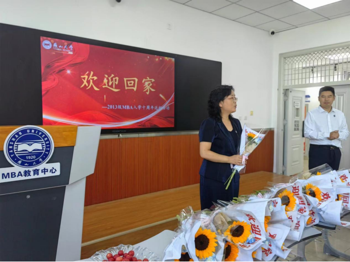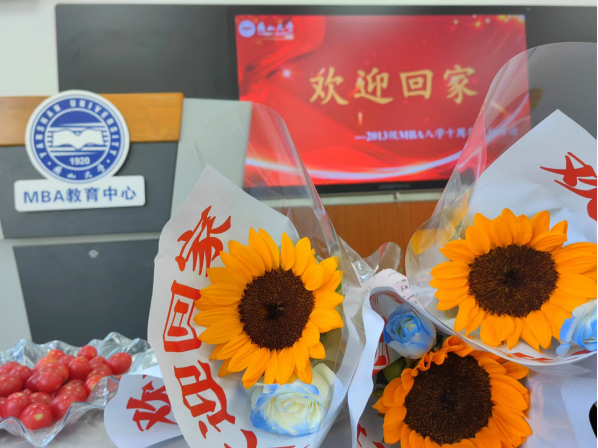 MBA教育中心谢玉梅特地为归来的学子们准备了印有“欢迎回家”字样的鲜花、燕大版的月饼和各色水果,款待大家。